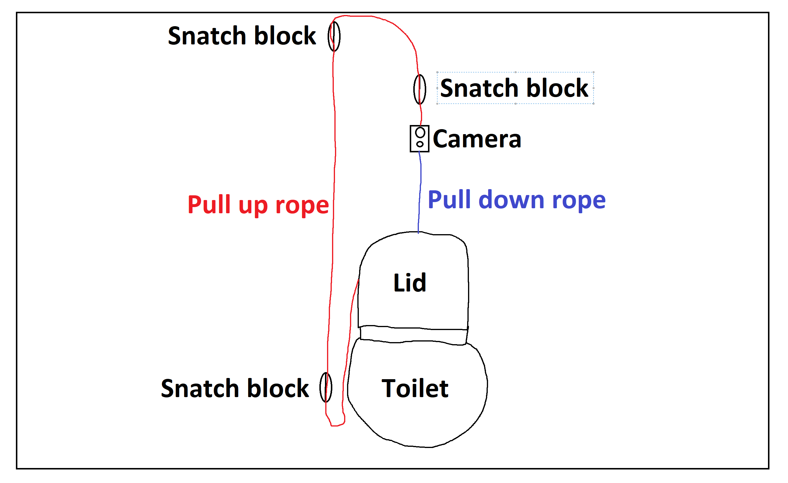 We need to mount the camera on a hinge. Then we need some snatch blocks and two ropes. Both ropes will be attached to the toilet lid.