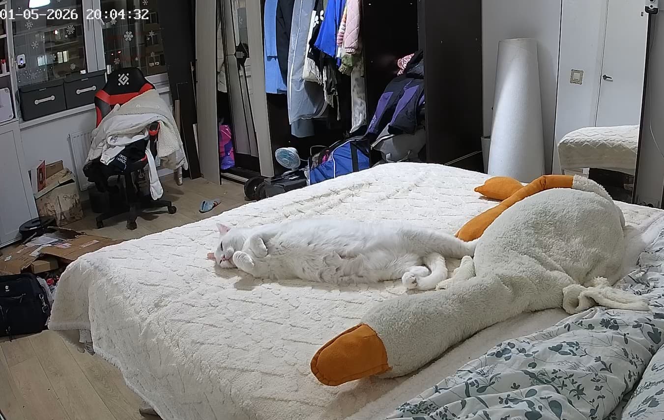Unfortunately, I’ve never seen the cat anywhere other than sleeping on the bed.