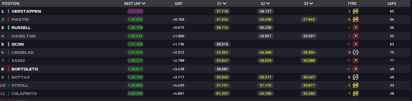 Morningsession done, normal racedistance is 57 laps, so most of the teams did a race distance this morning, no big problems, but also no hot laps yet