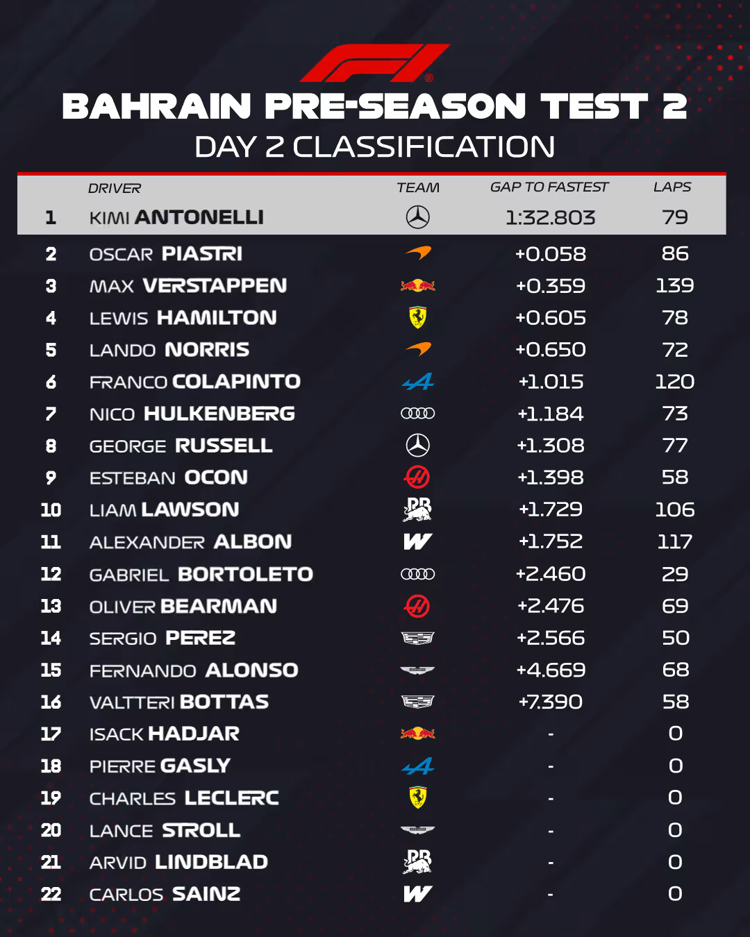 The times are moving towards the times achieved last time at the test in Bahrain, still a difference of over a second, tomorrow afternoon in the last hour we might see a few hot laps