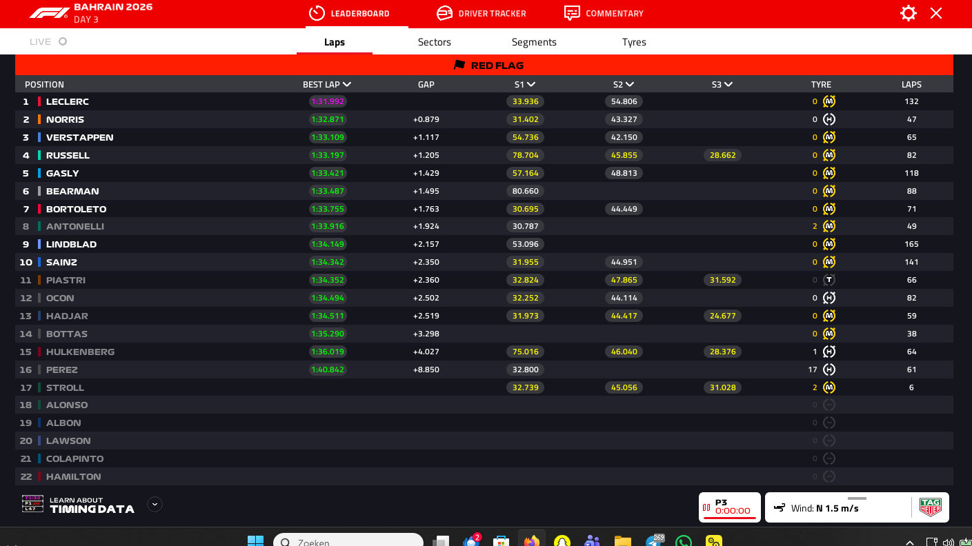 pour l’instant Leclerc a le meilleur temps en P3 essais pré-saison il reste 2h 43’ son temps 1.33.689