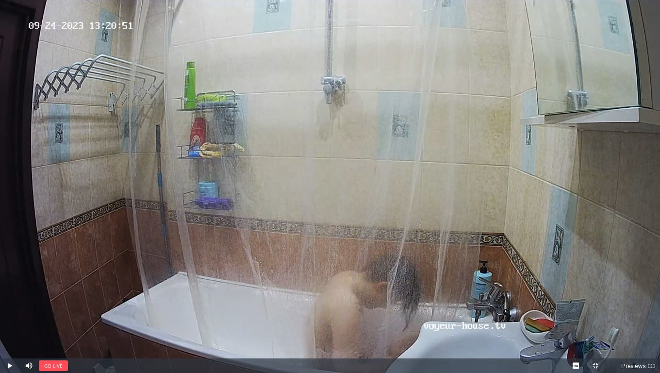 Дело не в том что она стесняется, а в том что так расположена камера. Она не может долго стоять(у нее болят ноги) поэтому сидит в ванне.