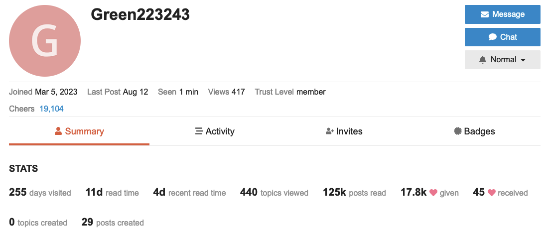 I don’t know how exactly the different points of the statistics are taken into account for the “cheers” number, or how difficult it would be to modify that weighting. But if you look into Green’s stats you’ll see a massive disproportion between likes given and likes received; only a handful of posts, the last one almost a month ago.