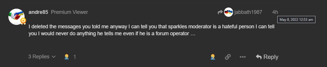 I deleted the messages you told me anyway I can tell you that sparkles moderator is a hateful person I can tell you I would never do anything he tells me even if he is a forum operator …