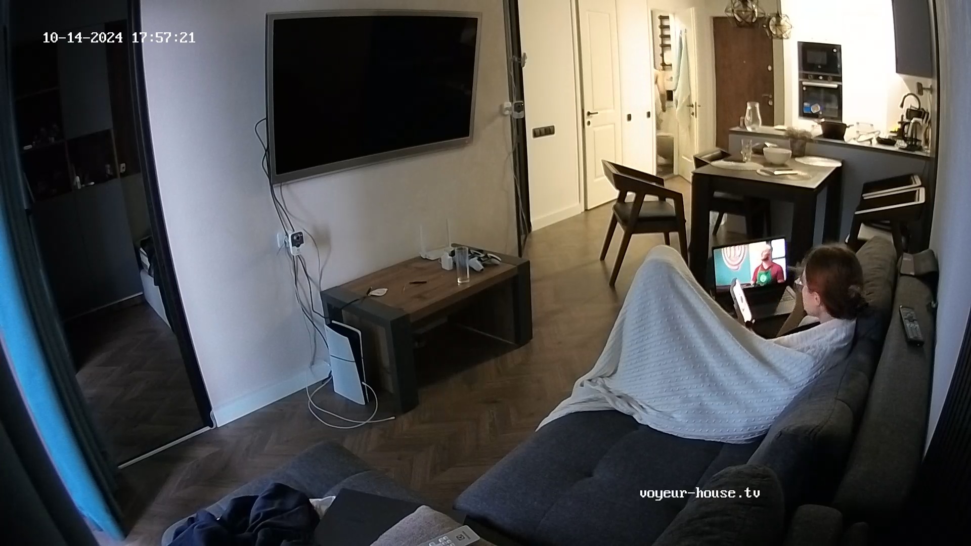 A very unusual picture from here. Marianthi fully clothed with PC on the sofa!
