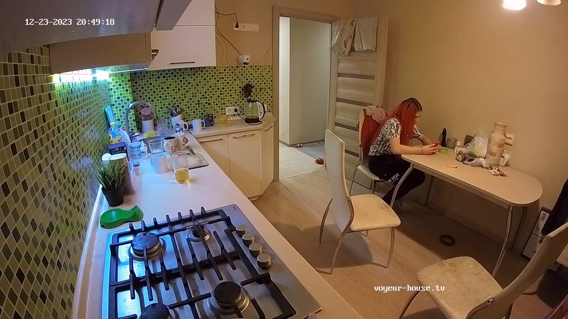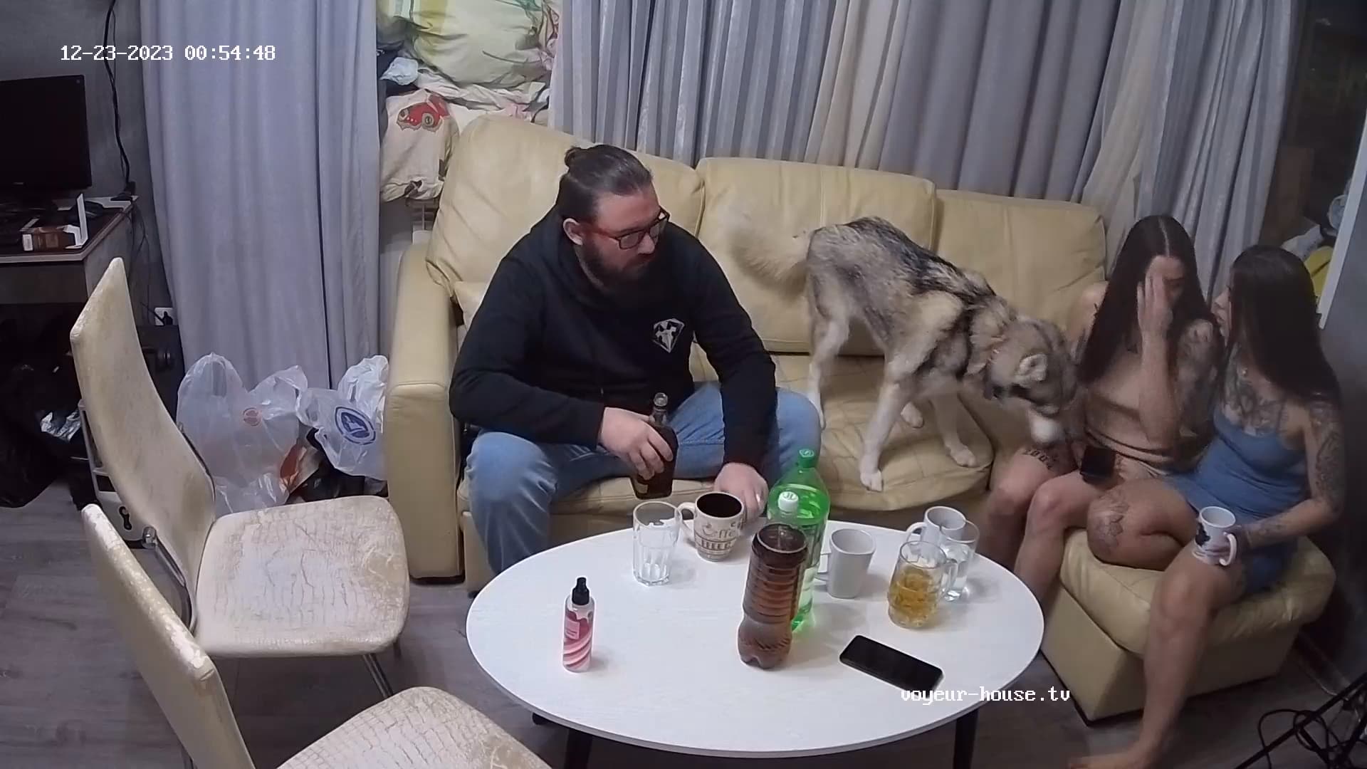 After being around the place naked all evening, alloversudden Trisha and Catia got dressed, and these two guys showed up.