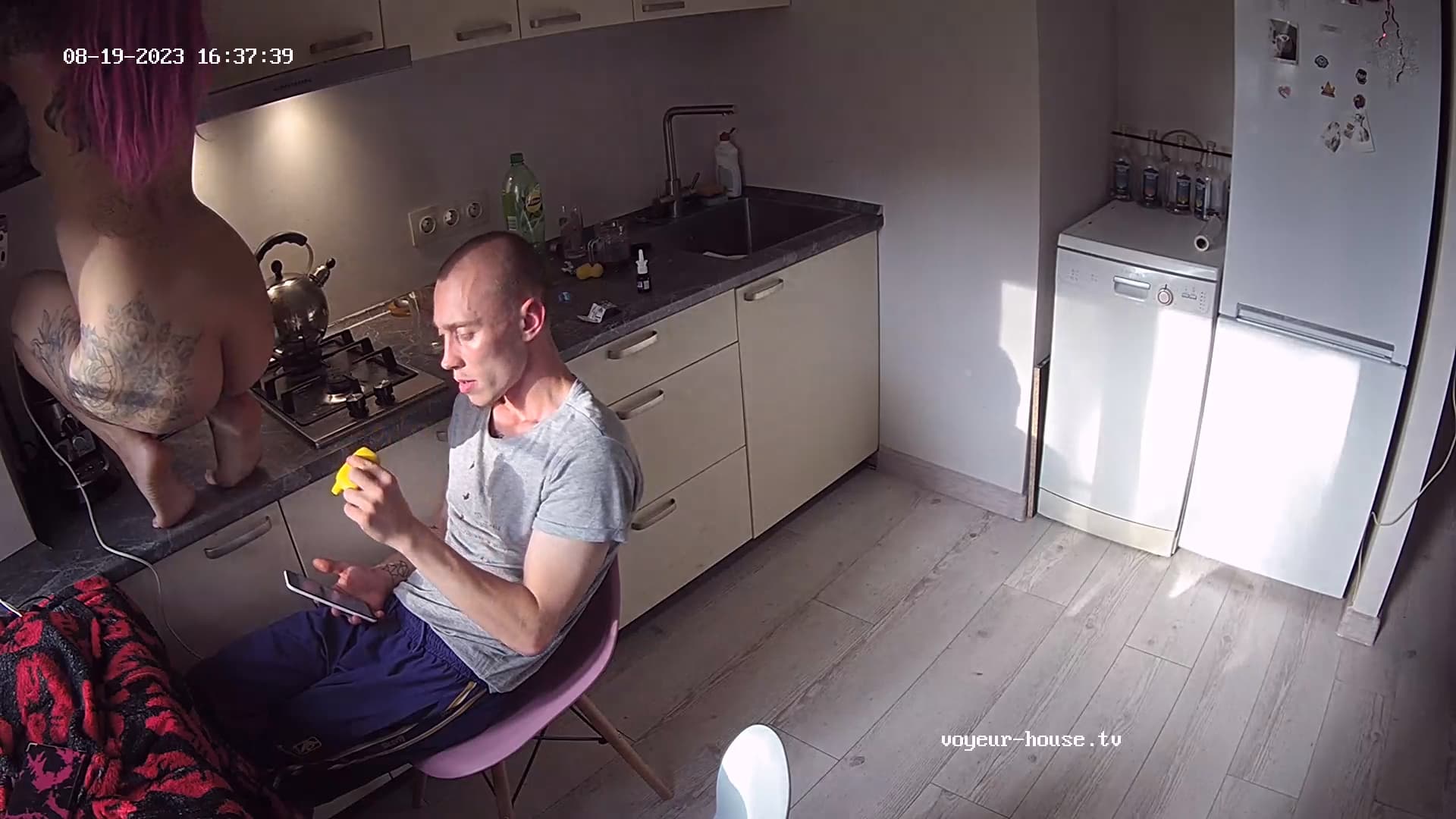 After smokebreak off-cam, and discard of Mr whitehat, Trisha tried to fuck Mr bald, who denied.