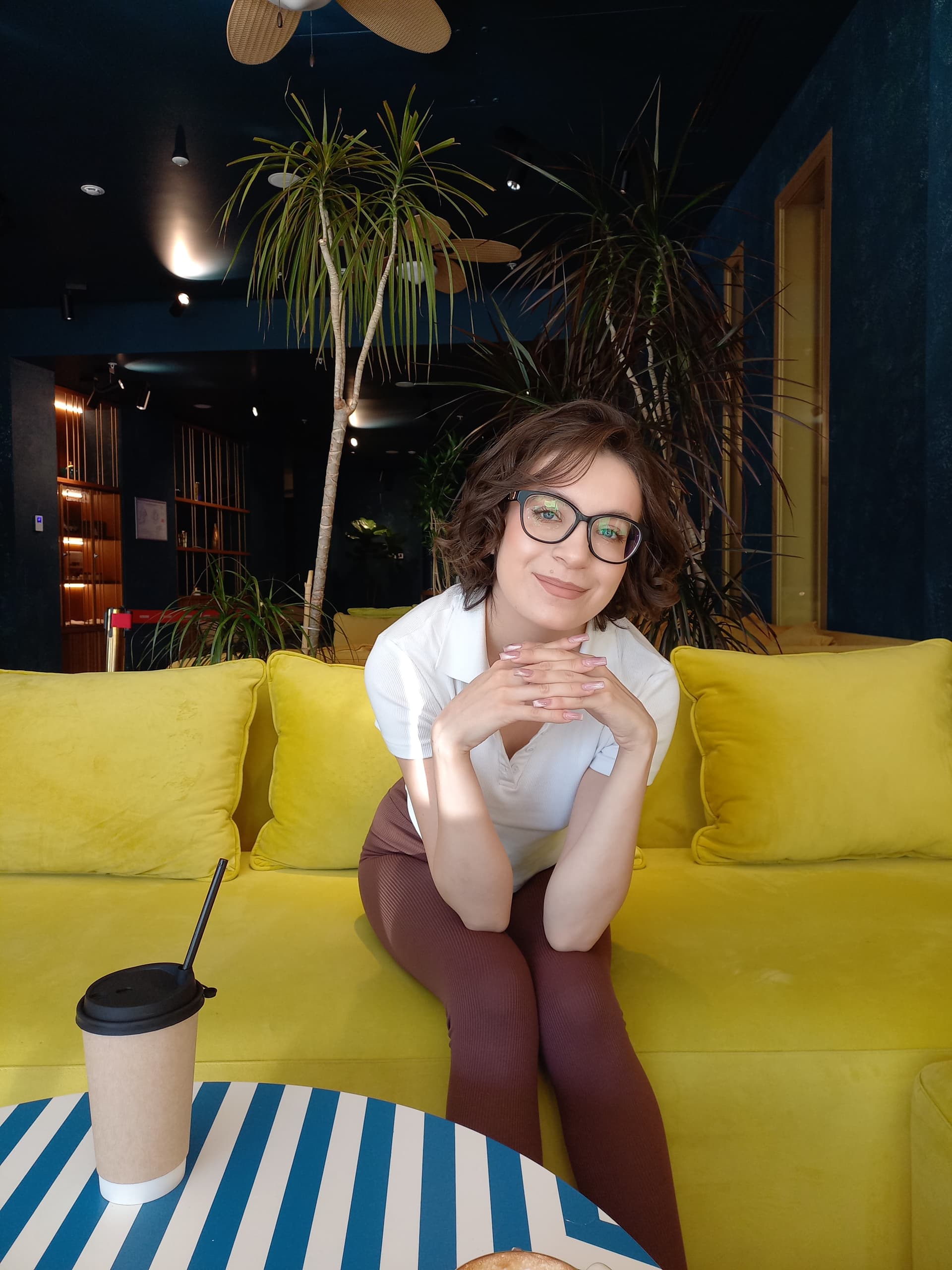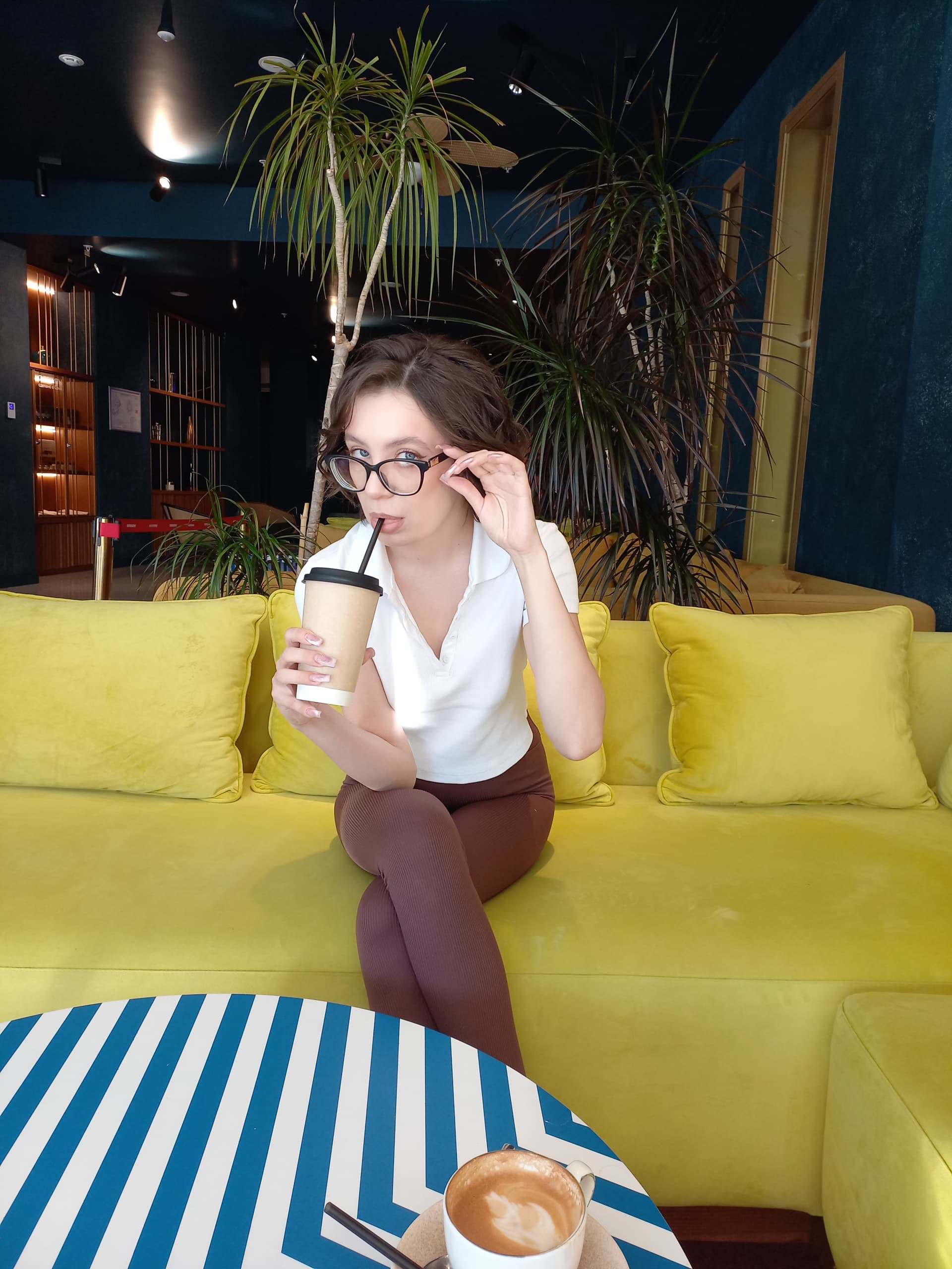 Is that a temporary brown hair coloration, a few shades lighter than usual, or just a trick of the lighting or some photoshop magic? Anyway, that color suits her very well, she is so beautiful. Lipstick, make-up and pants in a matching color palette, very well composed.