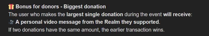 The user who makes the largest single donation during the event will receive: A personal video message from the Realm they supported.